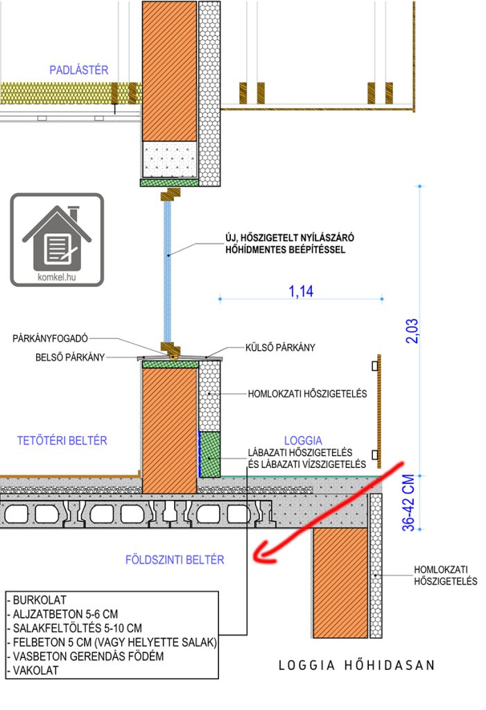 Tehát vagy a loggia födéme lefelé lóg ennyit eredetileg is, vagy a loggiára egy lépcsőfoknyit felfelé kell kilépni. Ha ez nem így van, akkor nincs megfelelő hőszigetelése, hőkamera nélkül is tudható, hogy hőhidas.