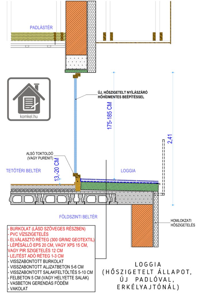 Durvább beavatkozás, ha a loggia padlóját hőszigeteljük. A jelenlegi burkolat alatt általában max 6-8 cm-t lehet még felbontani, magyarul a rendes hőszigetelt rétegrend kialakítása miatt a loggia magasabban lesz, mint a tetőtéri padlószint, egy lépcsőfoknyit felfelé kell kilépni majd, ami azzal jár, hogy az erkélyajtót cserélni kell.