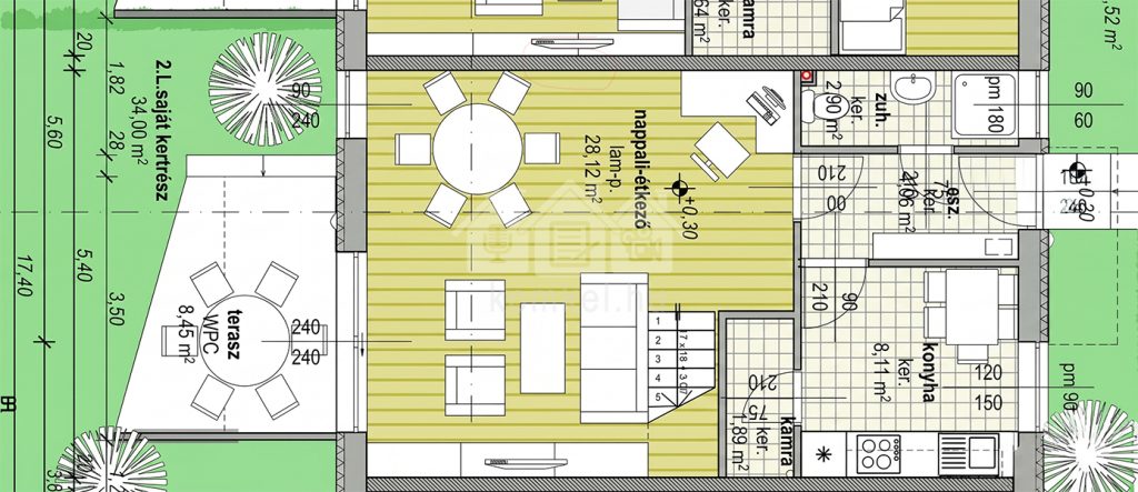 Nézzünk egy 3 lakásos sorházat, legyen 10 méter széles.
